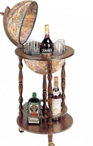 "TreEsse" firmas bāra globuss, ieturēts klasiskā stilā ar tumša koka apdari un kontrastējošu gaišu antīkas pasaules kartes reprodukciju. Globusam ir neliels iekšējais dzērienu turētājs, ka arī apakšējais plaukts pudelēm un glāzēm.